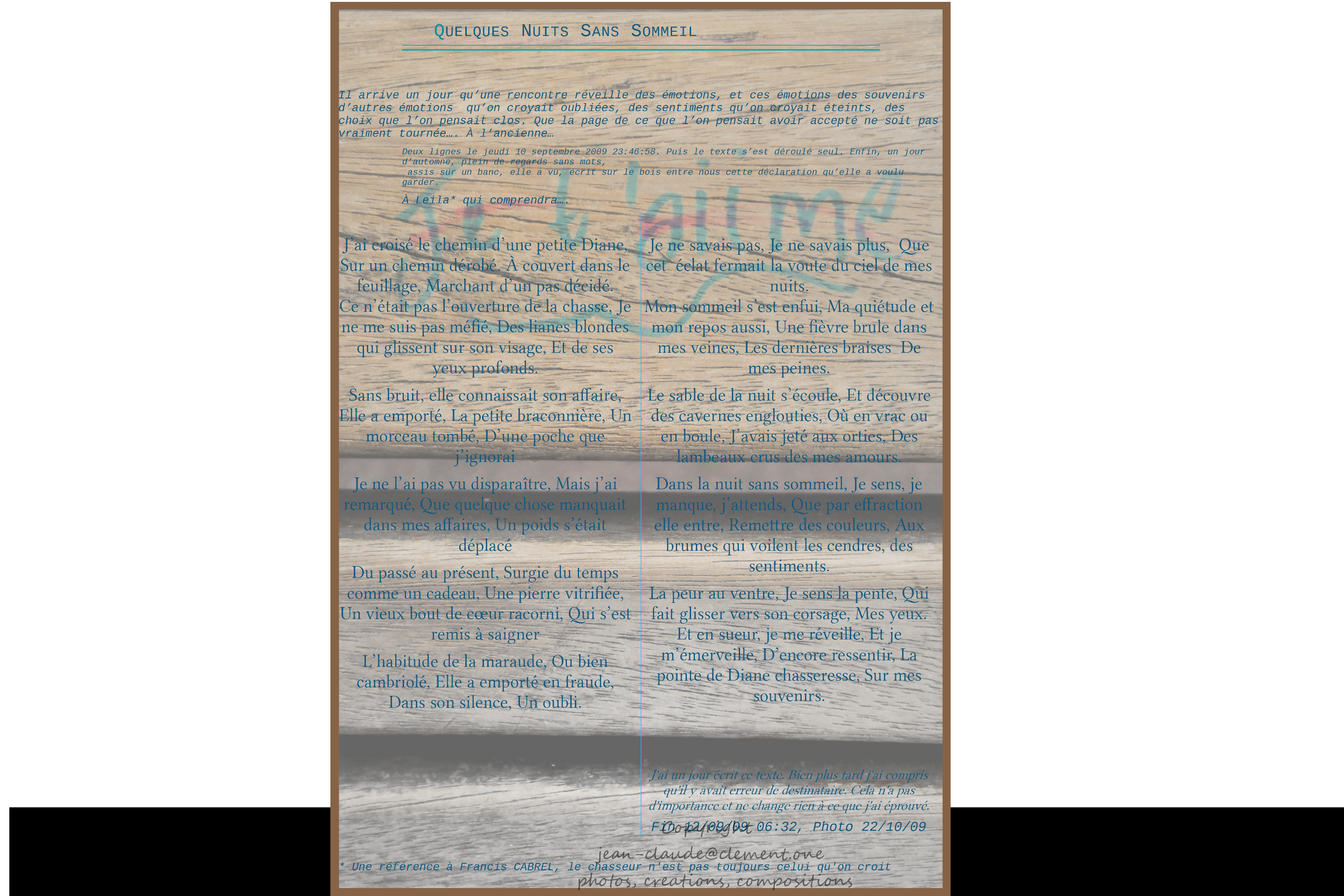 QUELQUES NUITS SANS SOMMEIL Il arrive un jour qu’une rencontre réveille des émotions, et ces émotions des souvenirs d’autres émotions qu’on croyait oubliées, des sentiments qu’on croyait éteints, des choix que l’on pensait clos. Que la page de ce que l’on pensait avoir accepté ne soit pas vraiment tournée…. À l’ancienne… Deux lignes le jeudi 10 septembre 2009 23:46:58. Puis le texte s’est déroulé seul. Enfin, un jour d’automne, plein de regards sans mots, assis sur un banc, elle a vu, écrit sur le bois entre nous cette déclaration qu’elle a voulu garder. À Leila* qui comprendra J’ai croisé le chemin d’une petite Diane, Sur un chemin dérobé. À couvert dans le feuillage, Marchant d’un pas décidé. Ce n’était pas l’ouverture de la chasse, Je ne me suis pas méfié, Des lianes blondes qui glissent sur son visage, Et de ses yeux profonds. Sans bruit, elle connaissait son affaire, Elle a emporté, La petite braconnière, Un morceau tombé, D’une poche que j’ignorai. Je ne l’ai pas vu disparaître, Mais j’ai remarqué, Que quelque chose manquait dans mes affaires, Un poids s’était déplacé. Du passé au présent, Surgie du temps comme un cadeau, Une pierre vitrifiée, Un vieux bout de cœur racorni, Qui s’est remis à saigner. L’habitude de la maraude, Ou bien cambriolé, Elle a emporté en fraude, Dans son silence, Un oubli. Je ne savais pas, Je ne savais plus, Que cet éclat fermait la voute du ciel de mes nuits. Mon sommeil s’est enfui, Ma quiétude et mon repos aussi, Une fièvre brule dans mes veines, Les dernières braises De mes peines. Le sable de la nuit s’écoule, Et découvre des cavernes englouties, Où en vrac ou en boule, J’avais jeté aux orties, Des lambeaux crus des mes amours. Dans la nuit sans sommeil, Je sens, je manque, j’attends, Que par effraction elle entre, Remettre des couleurs, Aux brumes qui voilent les cendres, des sentiments. La peur au ventre, Je sens la pente, Qui fait glisser vers son corsage, Mes yeux. Et en sueur, je me réveille, Et je m’émerveille, D’encore ressentir, La pointe de Diane chasseresse, Sur mes souvenirs. J’ai un jour écrit ce texte. Bien plus tard j’ai compris qu’il y avait erreur de destinataire. Cela n’a pas d’importance et ne change rien finalement. Fin 12/09/09 06:32, Photo 22/10/09 * Une référence à Francis CABREL, le chasseur n’est pas toujours celui qu’on croit