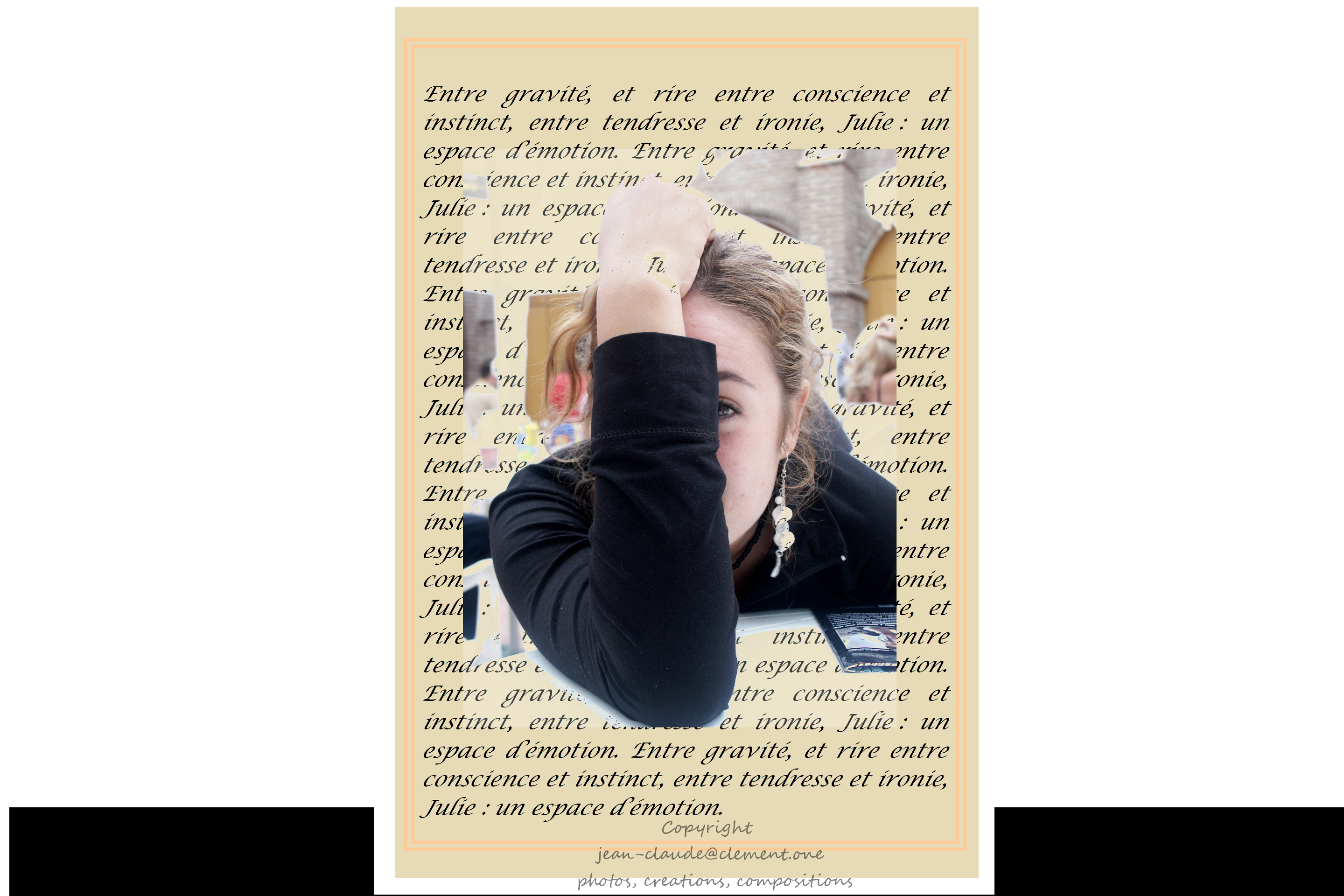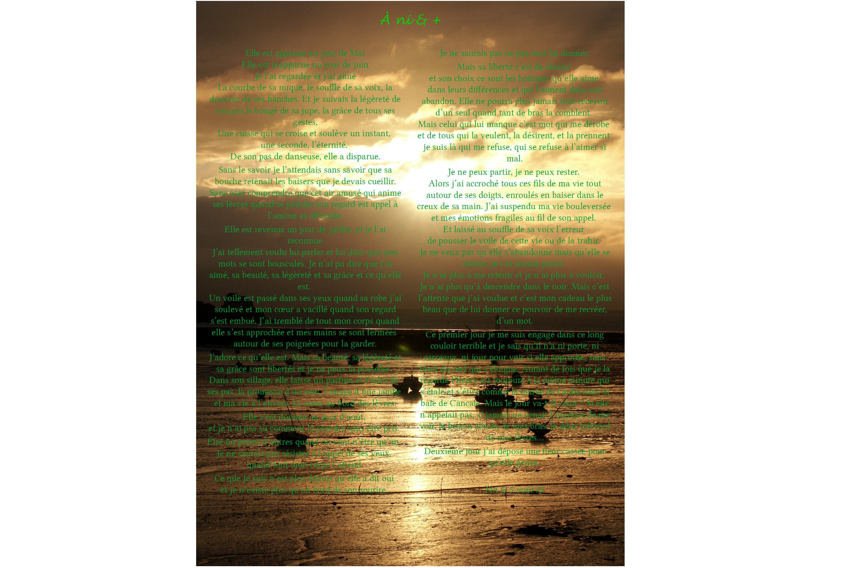 Elle est apparue un jour de Mai, Elle est réapparue un jour de juin. Je l’ai regardée et j’ai aimé la courbe de sa nuque, le souffle de sa voix, la douceur de ses hanches. Et je suivais la légèreté de son pas le bougé de sa jupe, la grâce de tous ses gestes, Une cuisse qui se croise et soulève un instant, une seconde, l’éternité. De son pas de danseuse, elle a disparue. Sans le savoir je l’attendais sans savoir que sa bouche retenait les baisers que je devais cueillir. Sans oser comprendre que cet air amusé qui anime ses lèvres quand se penche son regard est appel à l’amour et offrande. Elle est revenue un jour de juillet, et je l’ai reconnue. J’ai tellement voulu lui parler et lui dire, que mes mots se sont bousculés. Je n’ai pu dire que j’ai aimé, sa beauté, sa légèreté et sa grâce et ce qu’elle est.Un voile est passé dans ses yeux quand sa robe j’ai soulevé et mon cœur a vacillé quand son regard s’est embué. J’ai tremblé de tout mon corps quand elle s’est approchée et mes mains se sont fermées autour de ses poignées pour la garder. J’adore ce qu’elle est. Mais sa beauté, sa légèreté et sa grâce sont libertés et je ne peux la posséder. Dans son sillage, elle laisse un parfum et l’écho de ses pas, la promesse d’un sein, l’image d’une jambe et ma vie à l’envers. Le cœur au bord des lèvres. Elle s’est donnée un jour d’août, et je n’ai pas su comment la prendre sans être pris. Être un parmi d’autres quand on veut n’être qu’un. Je ne saurais pas résister à l’appel de ses yeux, quand tout mon corps l’attend.Ce que je suis n’est plus depuis qu’elle a dit oui et je n’existe plus qu’au bord de son sourire. Je ne saurais pas ne pas tout lui donner.. Mais sa liberté c’est de choisir et son choix ce sont les hommes qu’elle aime dans leurs différences et qui l’aiment dans son abandon. Elle ne pourra plus jamais tout recevoir d’un seul quand tant de bras la comblent. Mais celui qui lui manque c’est moi qui me dérobe et de tous qui la veulent, la désirent, et la prennent je suis là qui me refuse, qui se refuse à l’aimer si mal.Je ne peux partir, je ne peux rester. Alors j’ai accroché tous ces fils de ma vie tout autour de ses doigts, enroulés en baiser dans le creux de sa main. J’ai suspendu ma vie bouleversée et mes émotions fragiles au fil de son appel. Et laissé au souffle de sa voix l’erreur de pousser le voile de cette vie ou de la trahir. Je ne veux pas qu’elle s’abandonne mais qu’elle se donne. Je l’ai laissée partir. Je n’ai plus à me retenir et je n’ai plus à vouloir. Je n’ai plus qu’à descendre dans le noir. Mais c’est l’attente que j’ai voulue et c’est mon cadeau le plus beau que de lui donner ce pouvoir de me recréer, d’un mot. Ce premier jour je me suis engagé dans ce long couloir terrible et je sais qu’il n’a ni porte, ni carreaux, ni jour pour voir si elle approche, sans bruit du réel qui s’éloigne. Autant de fois que je la regarde l’heure est toujours à la même minute qui s’étale et s’étire comme la marée de l’aube dans la baie de Cancale. Mais le jour va-t-il venir ? Si elle n’appelait pas, si jamais ne venait l’urgence de me voir, le besoin absolu de mes bras, le désir infernal de mes lèvres… Deuxième jour j’ai déposé une fleur cassée pour qu’elle pense. Fin le 5 août 05