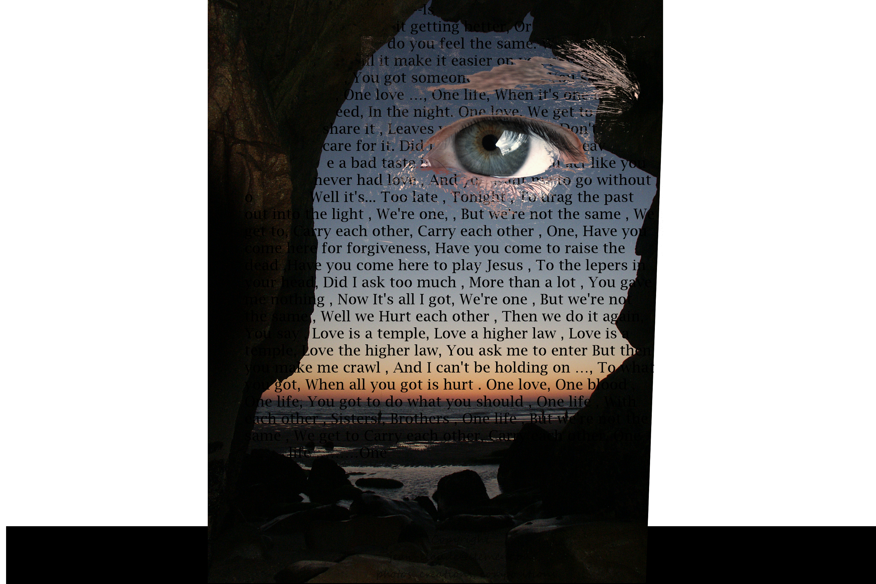 Is it getting better, Or do you feel the same. Will it make it easier on you, now you got someone to blame. You say, One love …, One life, when it’s one need, In the night. One love, We get to share it , Leaves you baby if you, Don’t care for it. Did I disappoint you , Or leave a bad taste in your mouth, You act like you never had love , And you want me to go without , Well it’s… Too late , Tonight , To drag the past out into the light, We’re one, , But we’re not the same , We get to, Carry each other, Carry each other , One, Have you come here for forgiveness, Have you come to raise the dead ,Have you come here to play Jesus, To the lepers in your head, Did I ask too much, More than a lot, You gave me nothing, Now It’s all I got, We’re one , But we’re not the same , Well we Hurt each other , Then we do it again , You say , Love is a temple, Love a higher law, Love is a temple, Love the higher law, You ask me to enter But then you make me crawl , And I can’t be holding on, To what you got, When all you got is hurt. One love, One blood , One life, You got to do what you should , One life, With each other , Sisters , Brothers , One life , But we’re not the same , We get to Carry each other, Carry each other. One life One
